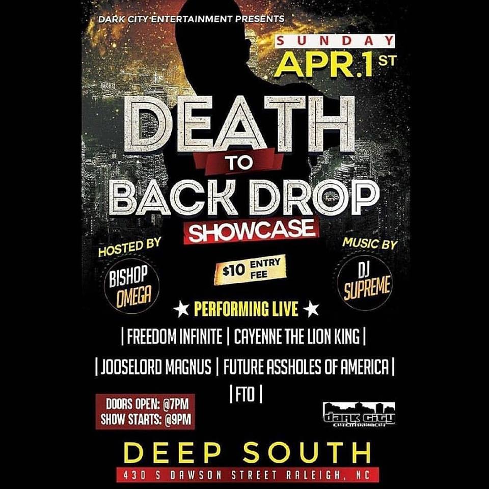The countdown Begins……… We are now hours away from one of the most exciting music events in the city of Raleigh. Death to Backdrops needs no explanation if you understand true Hiphop Culture. This Event is sure to bring and exclusive amount of high energy ,Classic Vibes,Top Lyricist and an Incredible Host.
